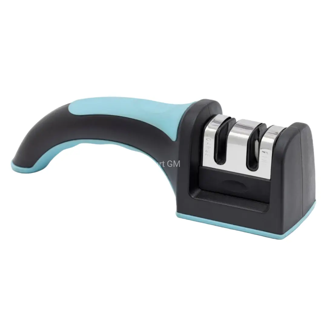 Trzymaj nóż na stole płasko ostrzem do góry. Drugą ręką chwyć ostrzałkę wsuwając dłoń w otwór zabezpieczający i przeciągnij po ostrzu noża od nasady po koniec używając wyczucia siły.