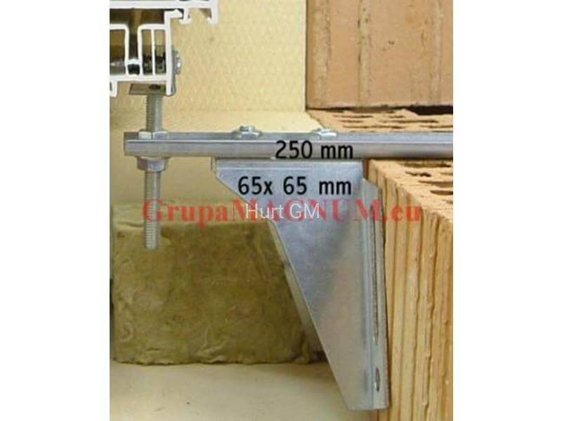 Konsole płaskie ze wzmocnieniem i regulacją wysokości WU-ST-250/2,5/65 łącznik kątowy jako konsola dolna do maksymalnego wysunięcia przy jednocześnie dużych obciążeniach. Konsole WU-ST pozwalają na montaż okien w znacznej odległości od muru nośnego co jest dość często spotykane ze względu na rosnącą grubość ocieplenia stosowanego w budownictwie. Ze względu na swoją budowę, konsole nie zawsze ściśle przylegają do powierzchni, występują zmiany długości do 2,0 mm. Z tego względu należy podawać wartości obciążeń przy zmianie długości o 5,0 mm.